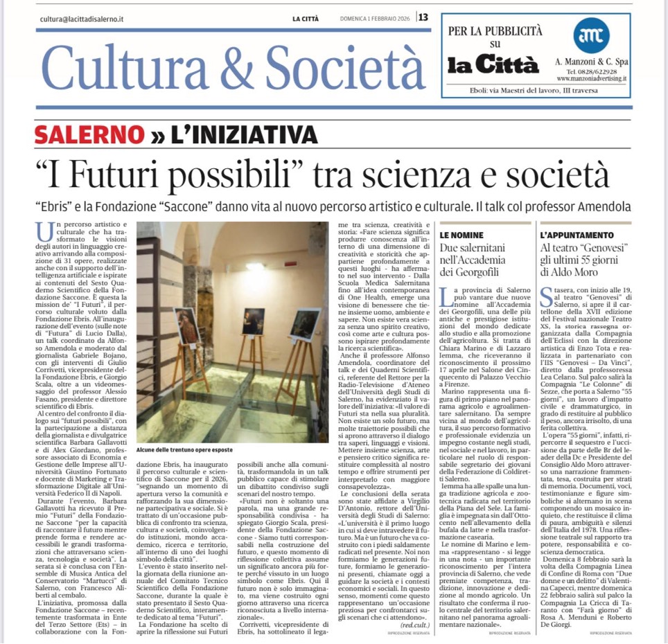 Trentuno opere visive, realizzate anche con il supporto dell’intelligenza artificiale e ispirate ai contenuti del Sesto Quaderno Scientifico della Fondazione Saccone, hanno dato vita a un percorso artistico e culturale che ha trasformato le visioni degli autori in linguaggio creativo. L’inaugurazione dell’evento si è aperta sulle note di “Futura” di Lucio Dalla, seguita da un talk coordinato da Alfonso Amendola e moderato dal giornalista Gabriele Bojano, con interventi di Giulio Corrivetti, vicepresidente della Fondazione EBRIS, e Giorgio Scala, oltre a un videomessaggio del professor Alessio Fasano, presidente e direttore scientifico di EBRIS.